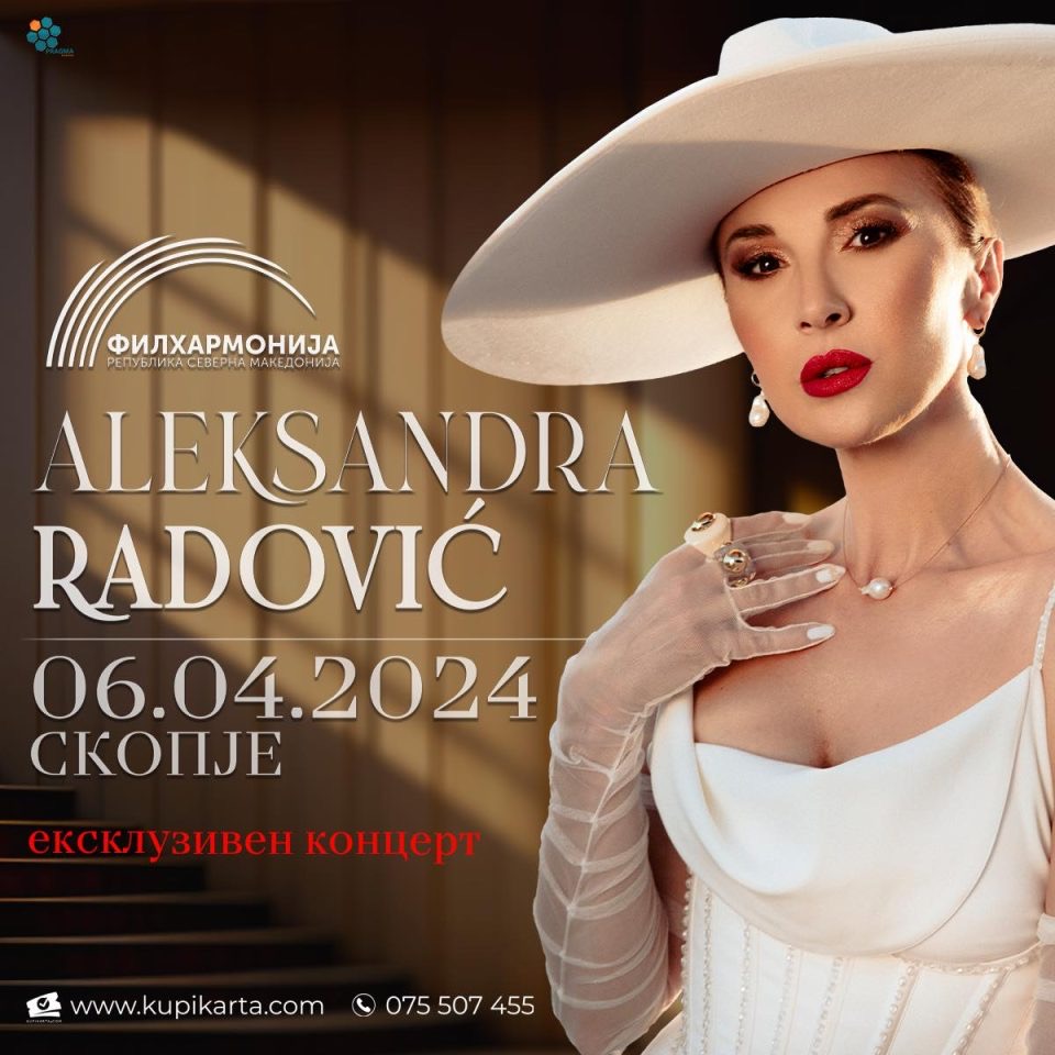 Taa ќe održi ekskluziven koncert vo nesekojdnevniot ambient na Makedonskata filharmonija, a nejziniot senzibilitet i emotivnite interpretacii ubedeni sme deka ќe ja osvojat i makedonskata publika. Pokraj nejzinite najgolemi hitovi „Čuvam te”, „Bivši dragi”, „Živeo kraj”, Aleksandra ḱe izvede i nekolku novi pesni, koi sigurno ḱe go predizvikaat vnimanieto na prisutnite. Zatoa, ne propuštajte da uživate vo nejziniot zanosen glas i da se predadete na magijata na preubavite refreni. Vleznicite za ovoj koncert se veke pušteni vo prodažba i istite može da gi kupite preku prodažnata mreža na www.kupikarta.com, Roze Vero 2 i JK Travel vo Biser- Skopje.