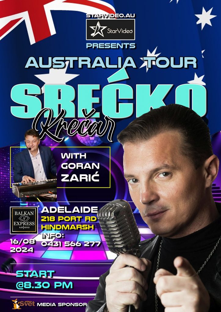 Sredinom avgusta, u Adelaidu, odnosno Melburnu, nastupiće fantastičan estradni umetnik Srećko Gajić – Krečar, koga pamtimo po nezaboravnom hitu “Pobednik” koji je ovog Kragujevčanina vinuo u muzičku orbitu.