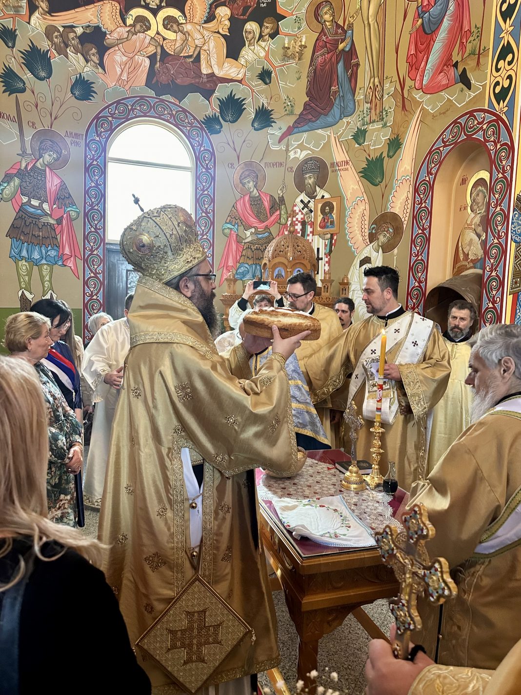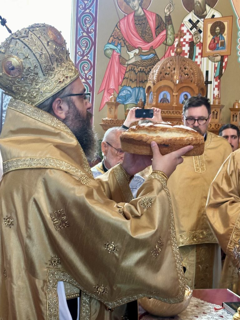 Po završetku molitve, Njegovo visokopreosveštenstvo je osvetilo a potom preseklo slavski kolač koji je pripremila domaćica slave Biljana Ljiljak, predsednica Kola sestara i deo istog predala domaćici za iduću godinu Nevenki Grmuši.